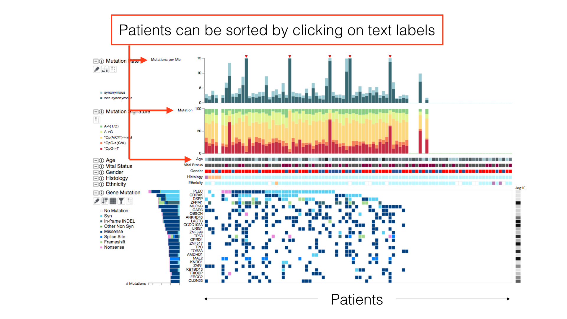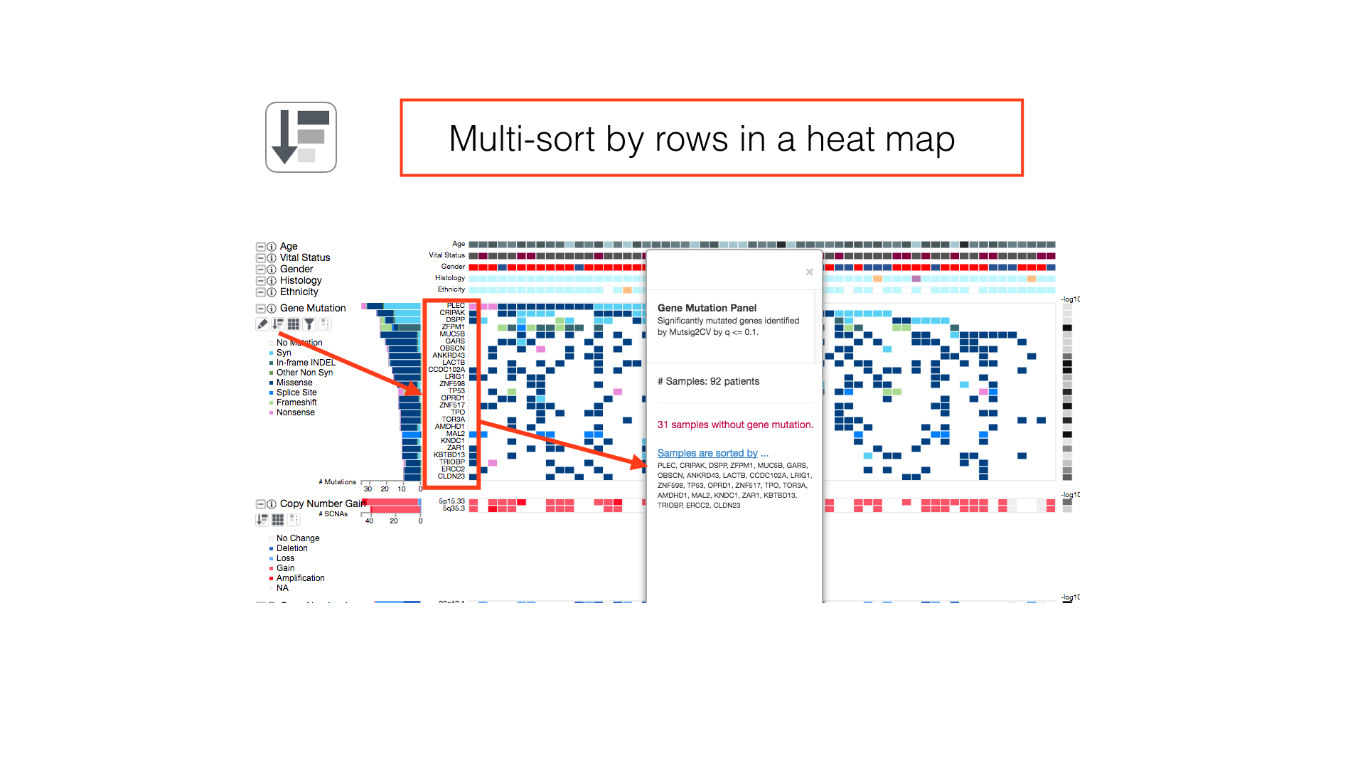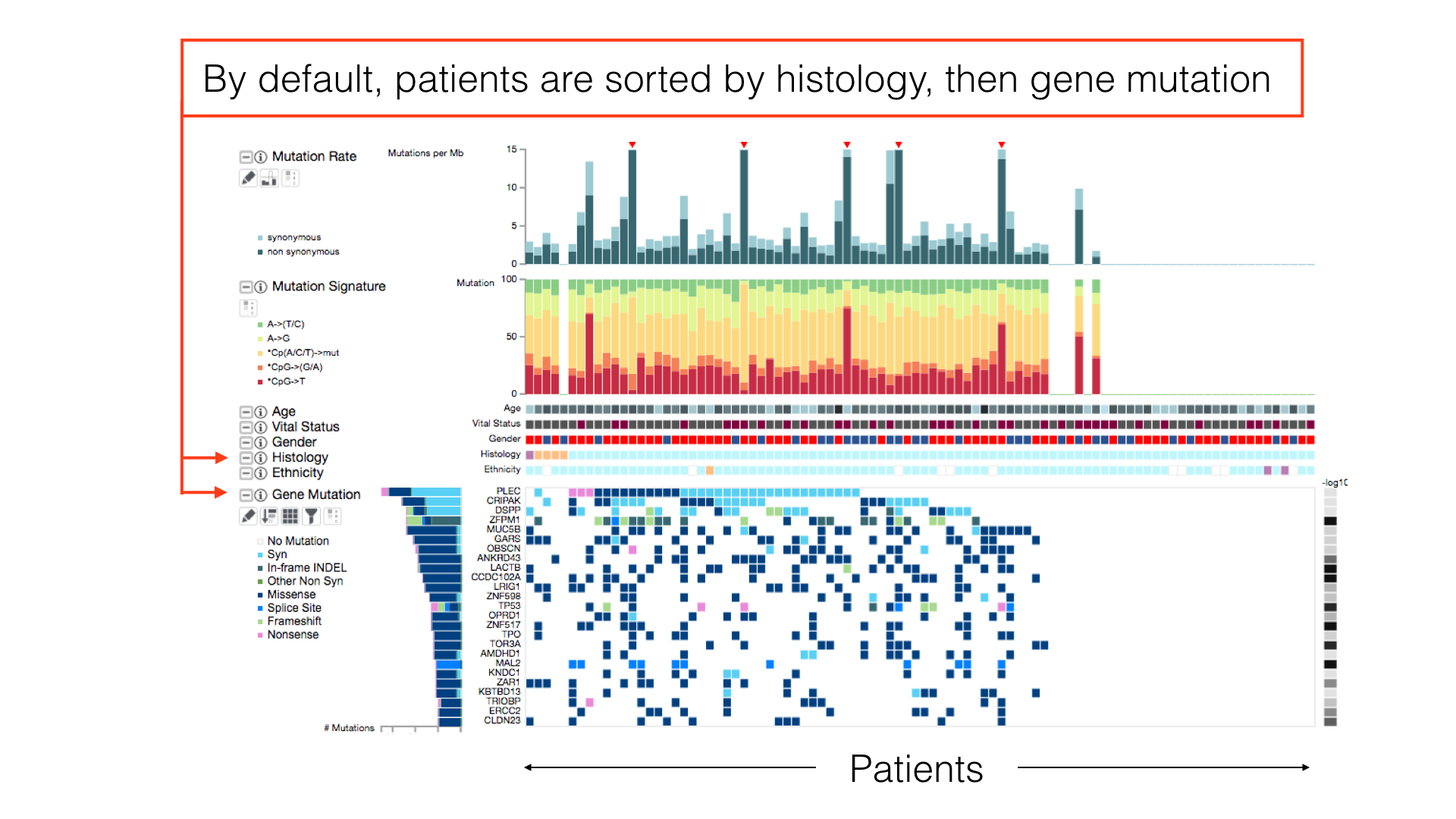 By default, patients in a cancer cohort are sorted first by the histological subtypes (if available), then by the gene mutations.