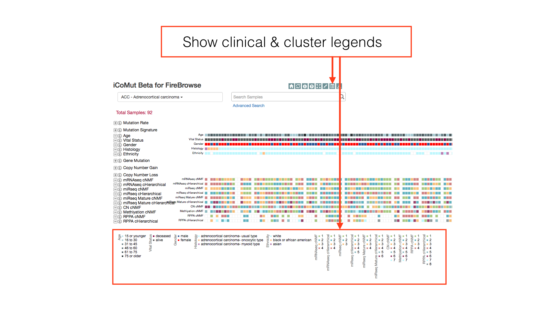 Show the clinical and cluster legends with the toggle hidden legends button in the main toolbar.