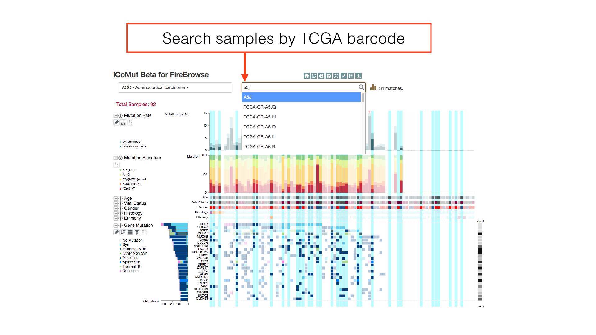Use the sample search bar to highlight individual patients by TCGA barcode. Regular expression matching can be used to select multiple patients in a single search token.