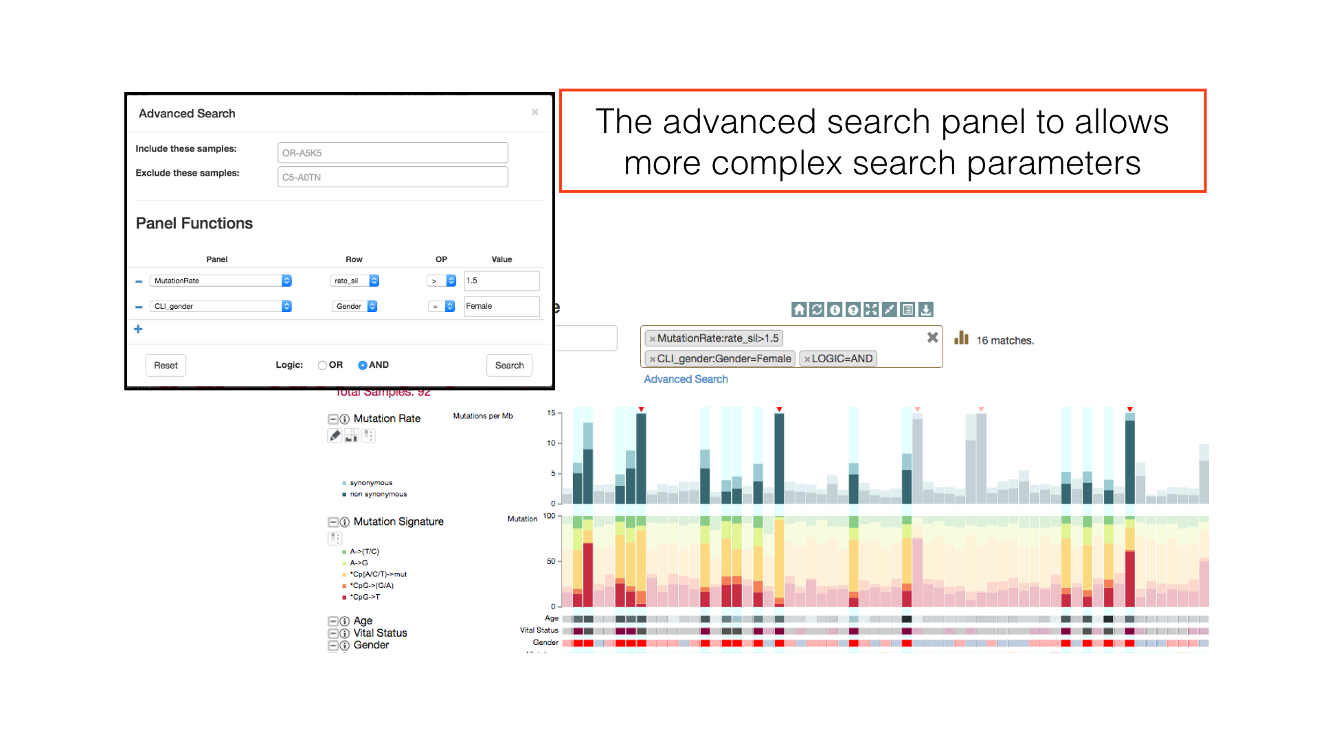 the search returns all female patients with a synonymous mutation rate above 1.5.